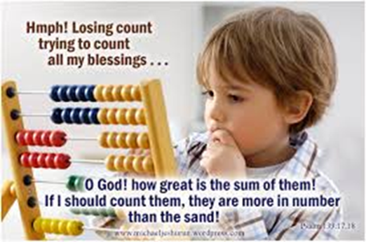 Let us sign into God’s spiritual Math Class during Thanksgiving Season. Begin talking about the good things He has done. First, I thank Him for choosing me to be His child. I praise Him for the BIBLE that provides Salvation and benefits of Healing and Peace. I thank Him for Jesus, my very Best FRIEND, I thank Him for giving me a Purpose for today and into Eternity. I can sing this HYMN and easily COUNT TO TEN. Can you?